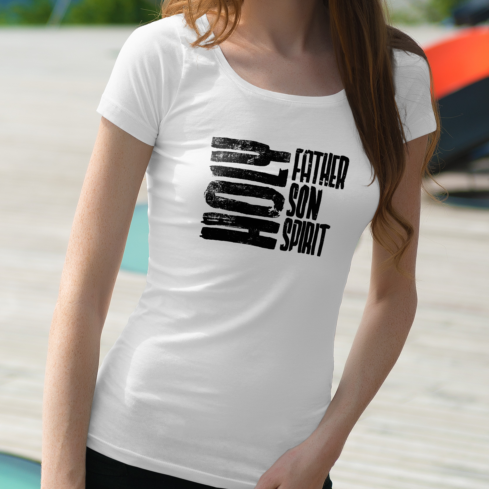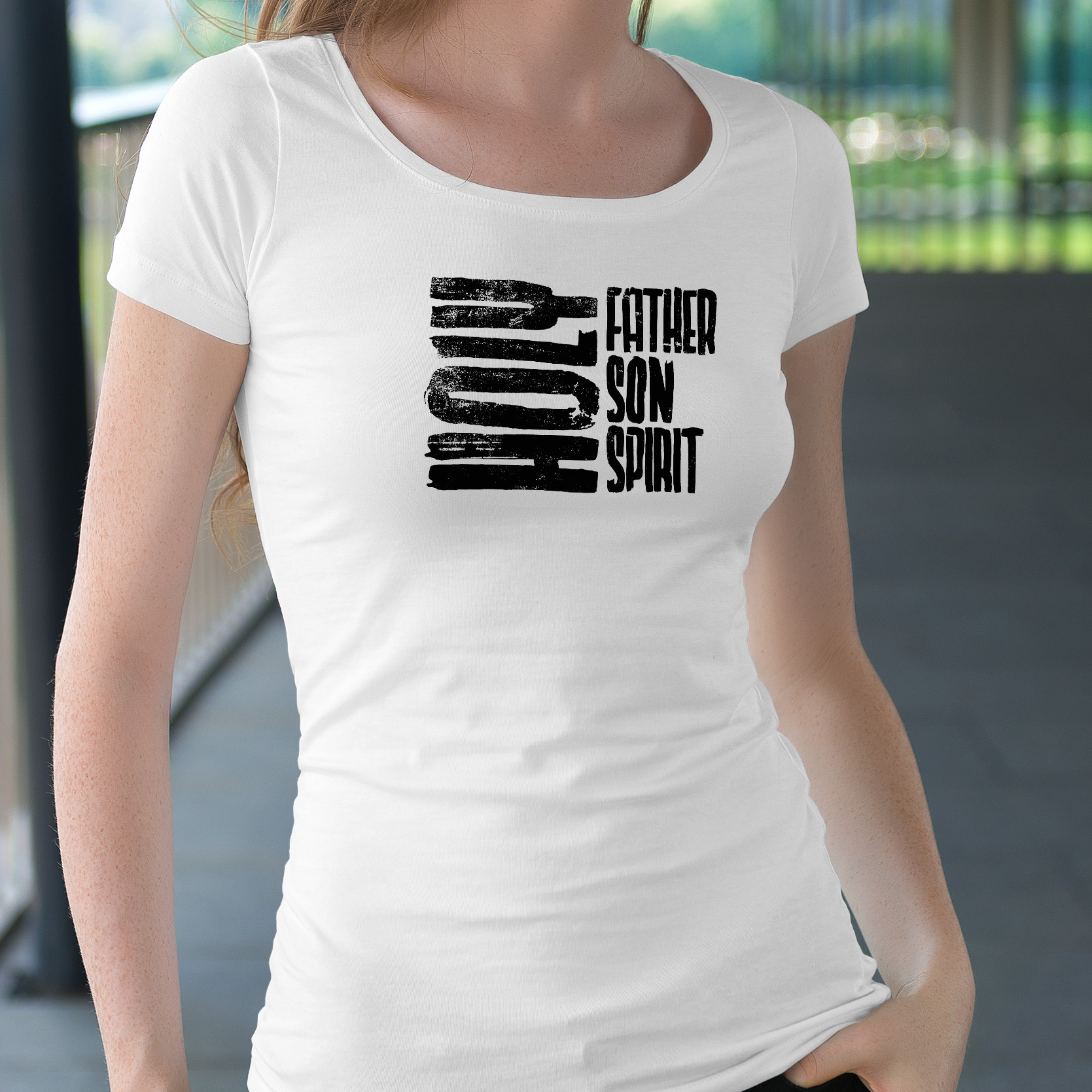 Auf dieses klassische weißes Girlie-T-Shirt mit rundem, etwas breiterem Halsausschnitt wurde auf die Vorderseite groß das Wort "Holy" gedruckt. Daneben steht "Father, Son, Spirit".