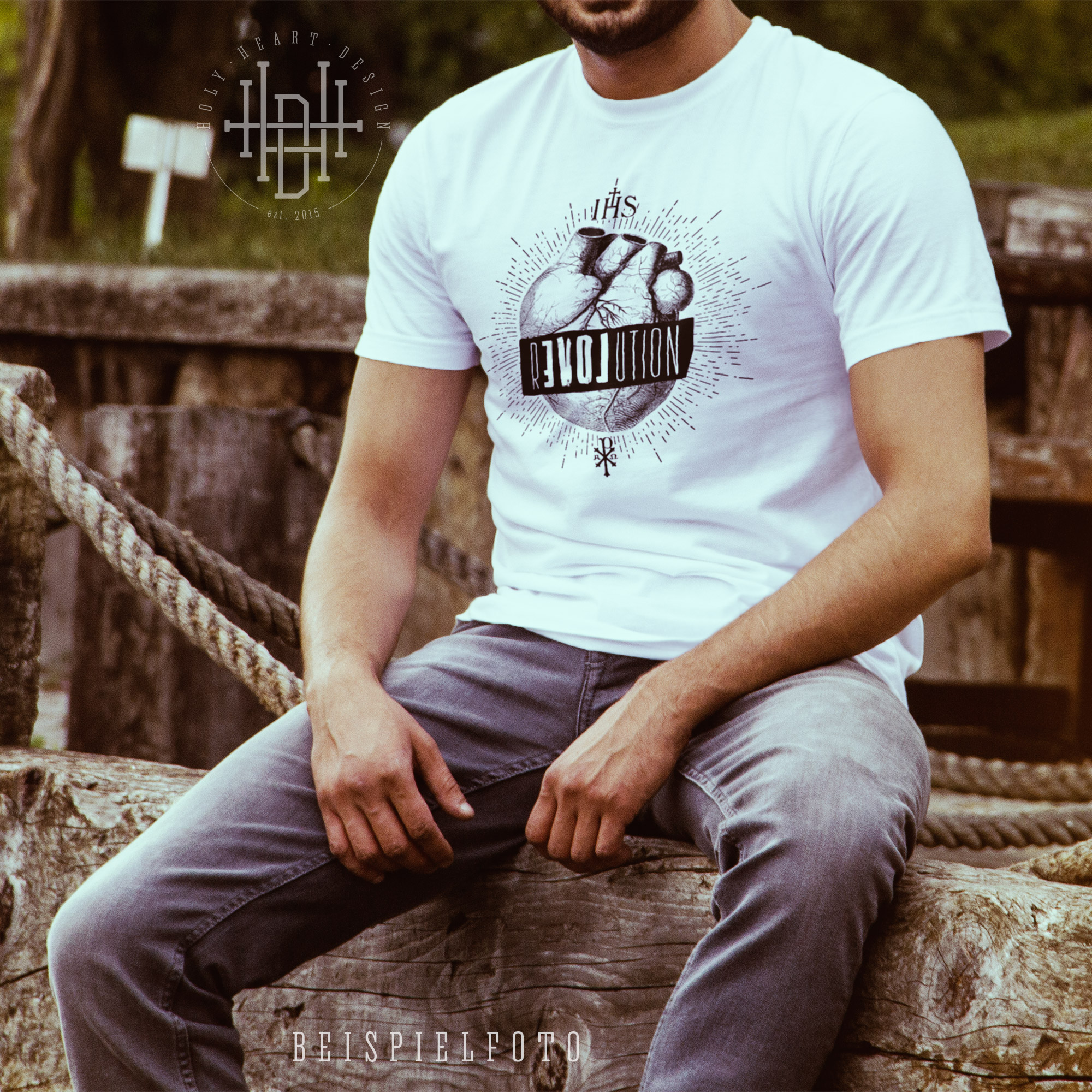 Auf dieses klassische weiße T-Shirt mit Rundhals wurde auf die Vorderseite das Motiv Revolution mit dem hervorgehobnen Wort "LOVE" in schwarz gedruckt.