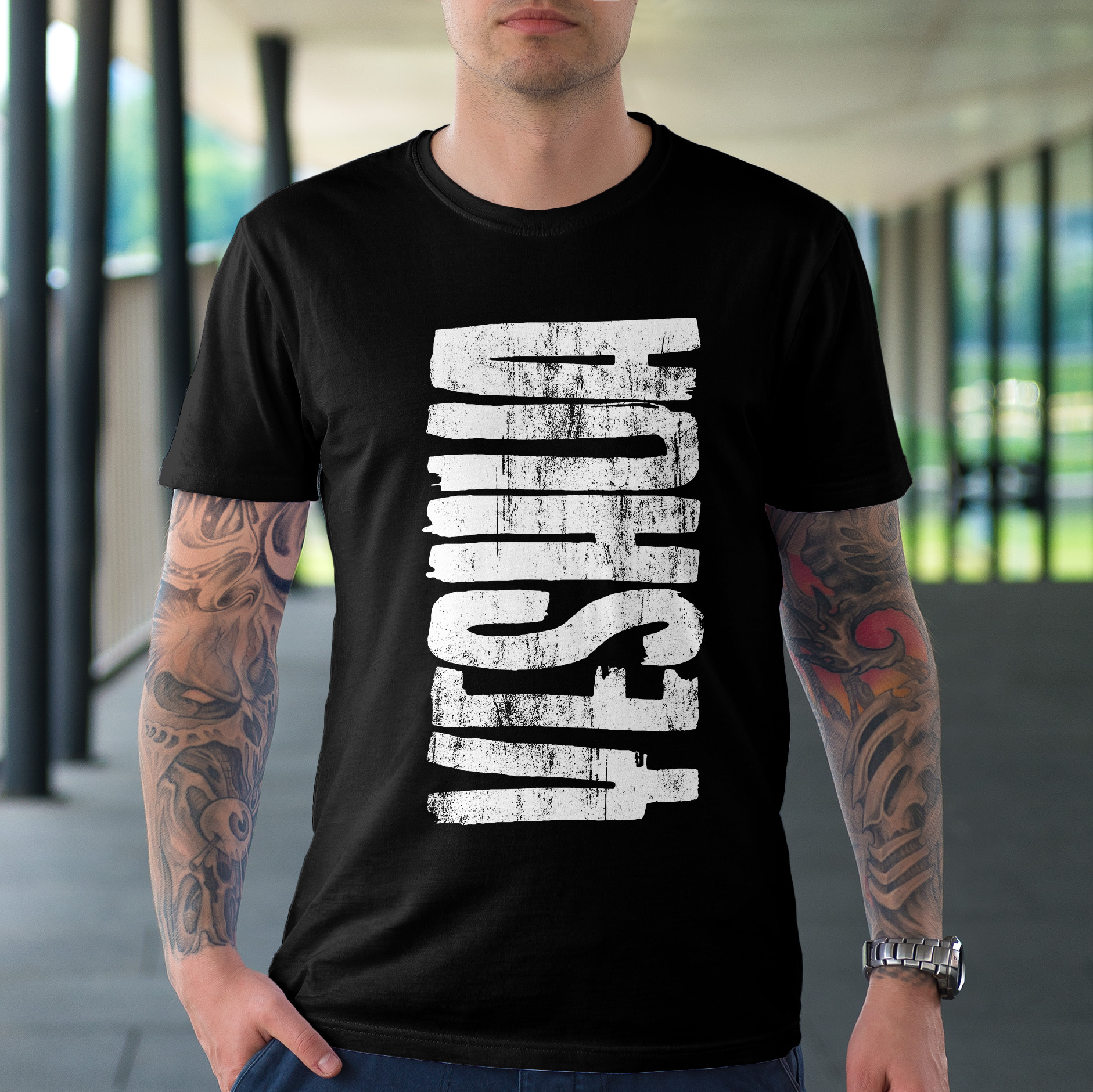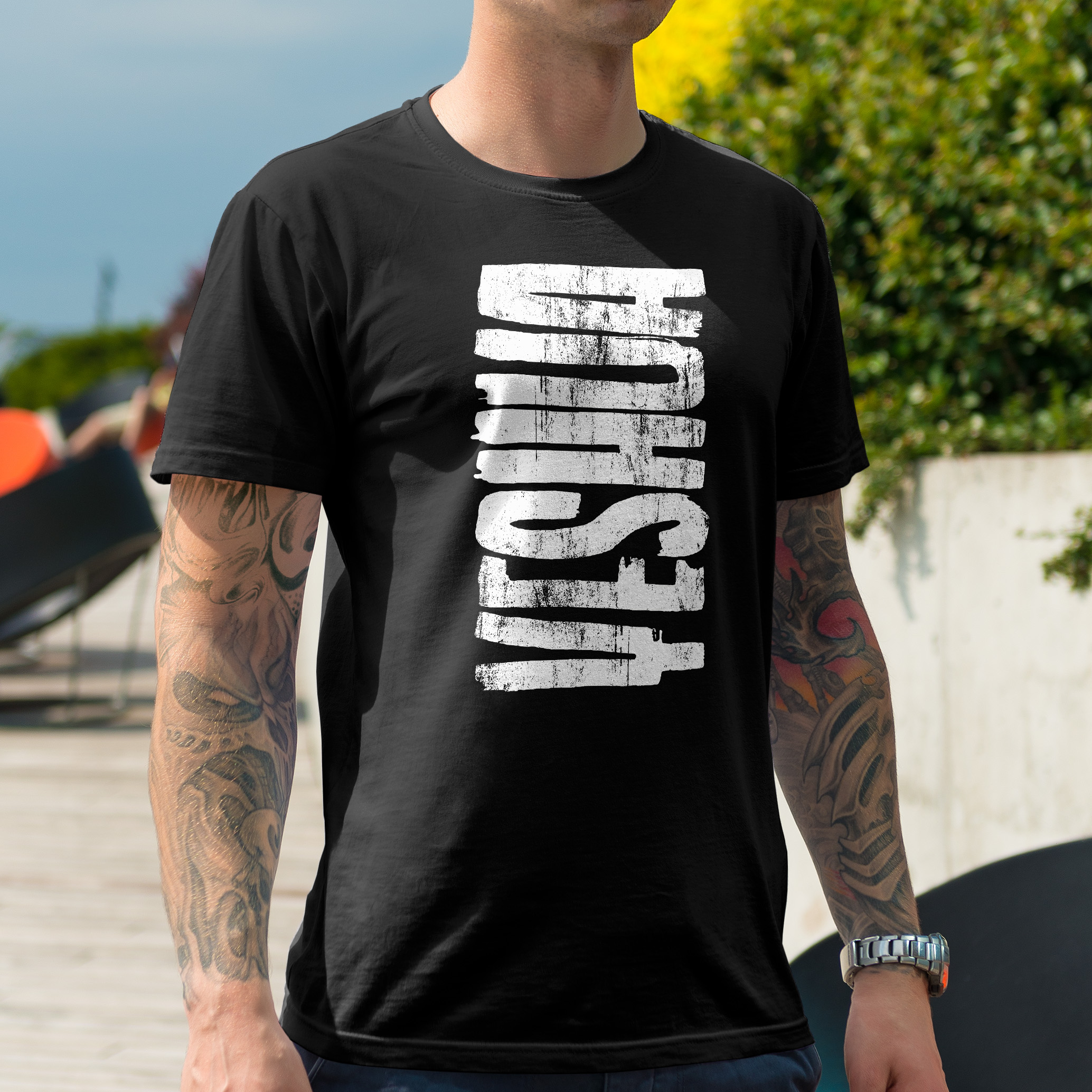Auf dieses klassische schwarze T-Shirt mit Rundhals wurde auf die Vorderseite das Wort YESHUA (Jesus) gedruckt.
