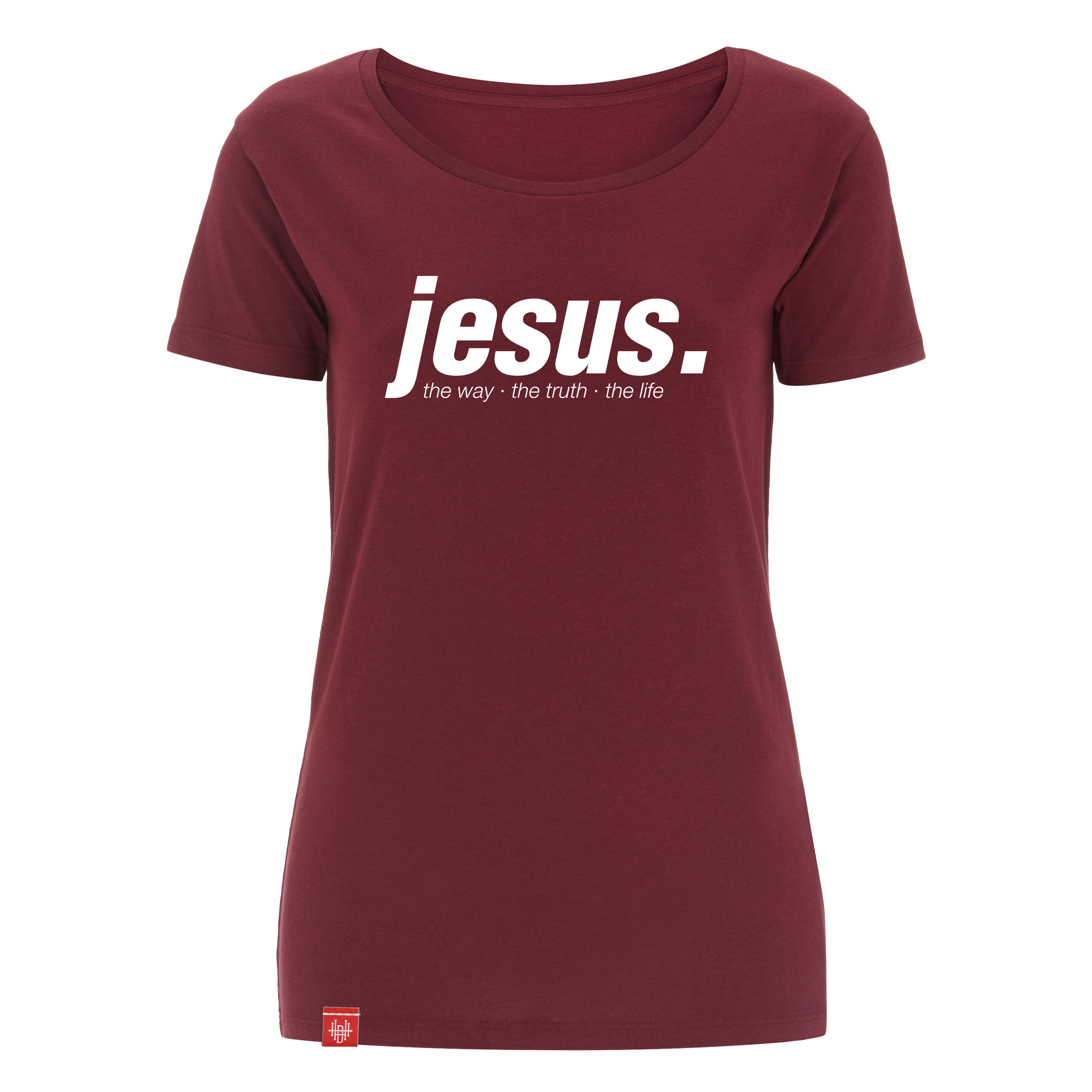 Auf diesem klassischen Girlie-Shirt mit weiterem Rundhals ist auf der Vorderseite der Schirftzug "jesus." zu sehen. Darunter stehen die Worte "the way. the thruth. the light."