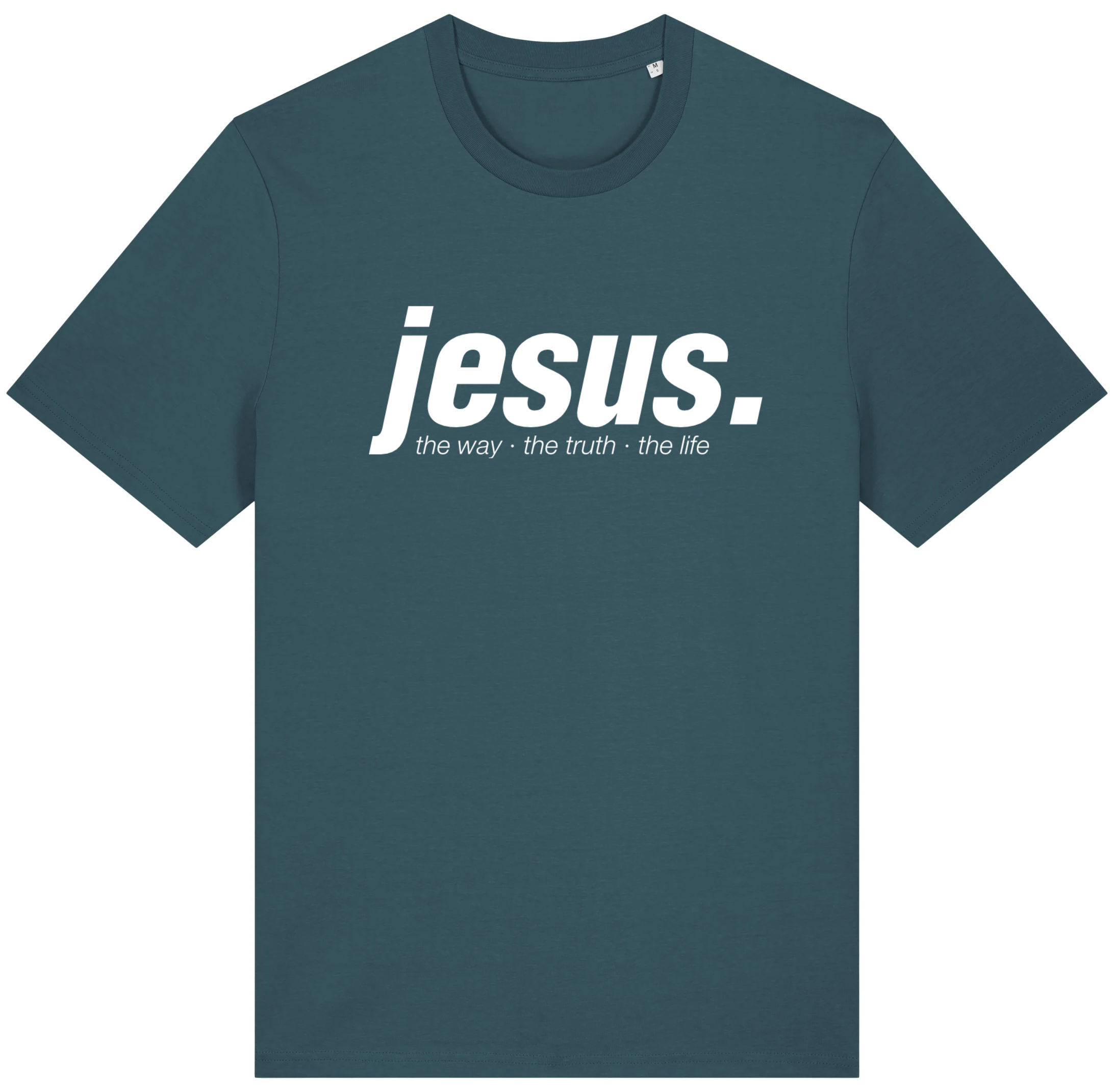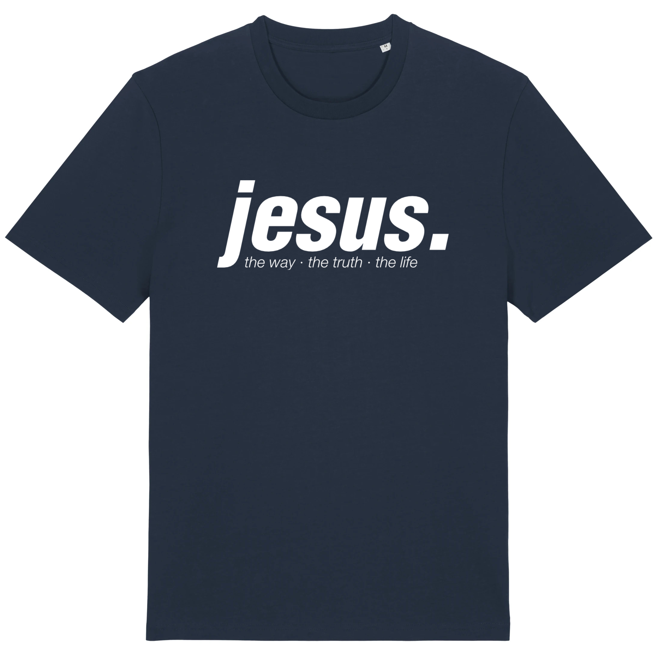 Auf diesem klassischen T-Shirt mit Rundhals ist auf der Vorderseite der Schirftzug "jesus." zu sehen. Darunter stehen die Worte "the way. the thruth. the light."
