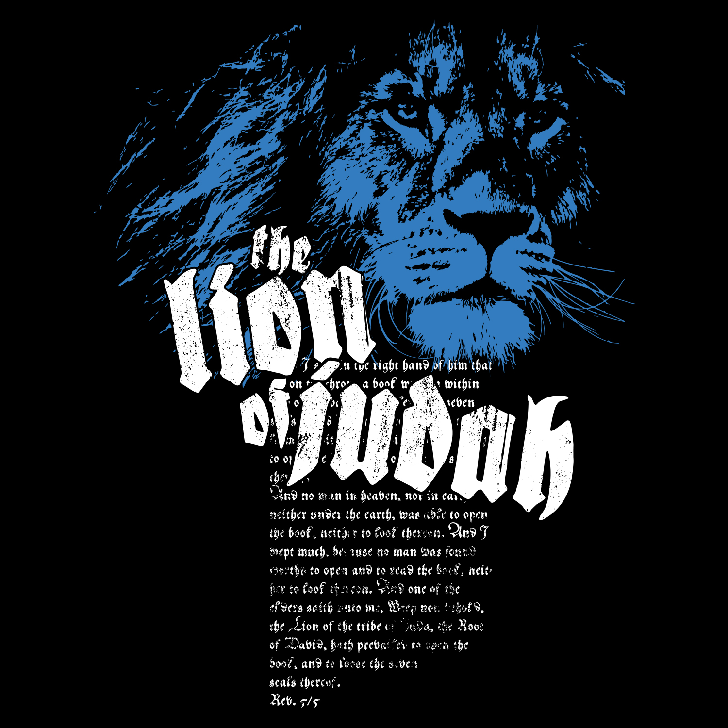 Auf diesem klassischen schwarzen T-Shirt ist auf der Brust ein Löwenkopf zu sehen, welcher Jesus symbolisiert. Im Hintergrund ist der Text aus Offenbarung 5 abgebildet.
