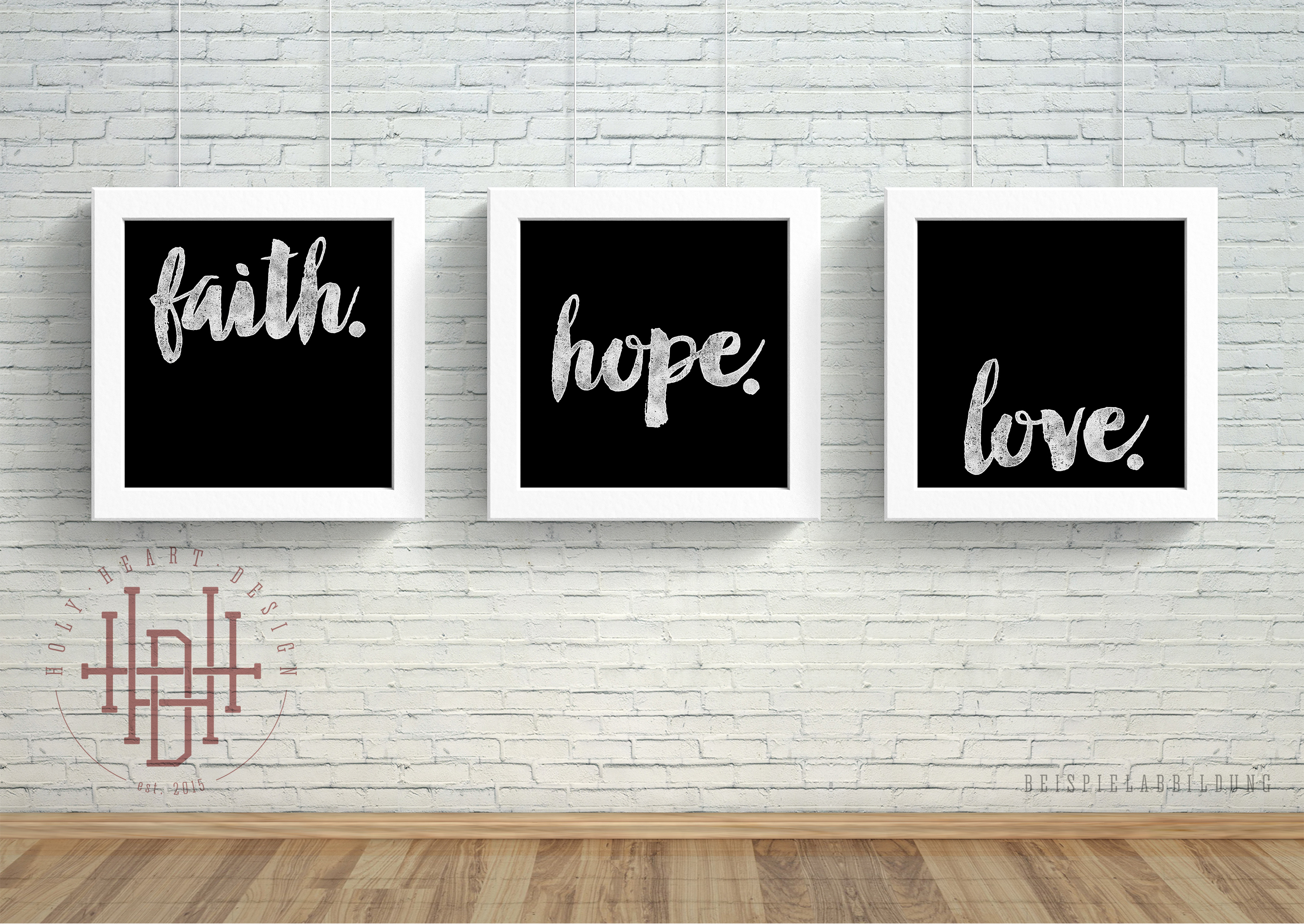 Hochwertiger Druck der Worte "Glaube – Hoffnung – Liebe" auf 3 quadratische Poster mit schwarzem Hintergrund. In diesem sind Auszüge aus dem Hohenlied der Liebe (Korinter 13) erkennbar.